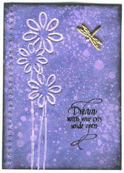 The flowers are embossed (actually debossed as I put the paper in the folder wrong).. with a Cuttlebug embossing folder border image. Quite often I like to highlight embossing by either sanding off color or inking the high spots... however, since I put the paper in the wrong way, I needed to think of something else to do... white Inkssential pen to the rescue! "Dream..." stamped with black ink and also black ink sponged around the edges. Along the left edge I used the Tim Holtz ruler and an awl to pierce holes. I pierced them from the back for added texture on the front. A dragonfly brad finishes it off nicely. (On my screen this looks blue but irl it is actually lavender.. color name is blue violet). |