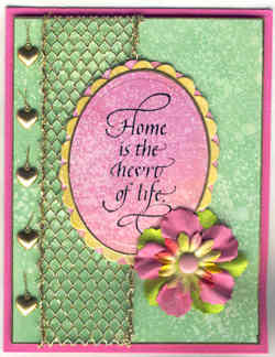 I started with the first paper in pic #3. Stamped "Home is.." on it with black ink and then cut it out with a Nestabilities die. To be honest.. I first cut it out with a scalloped oval but I didn't get the words lined up straight inside the oval and so recut it with a regular oval... I however, again didn't get it lined up but decided to try and make it work rather than starting over. I edged the oval with a gold Krylon. I colored another piece of glossy paper using gesso spritz and #227 yellow ochre.. cut it with a scalloped oval die and layered the "Home is" piece onto it. I then took the scallops that I had cut off of the original oval and layered them behind the yellow piece. Next I colored another piece of glossy paper using gesso spritz and #600 green and edged it with gold Krylon. Wrapped this with a gold mesh ribbon and then layered it to a folded pink card. Layered on the "Home is.." piece. Tied gold string to the heart charms and attached them along the left with glue dots. Finished off the card with a brad and paper flowers. |
