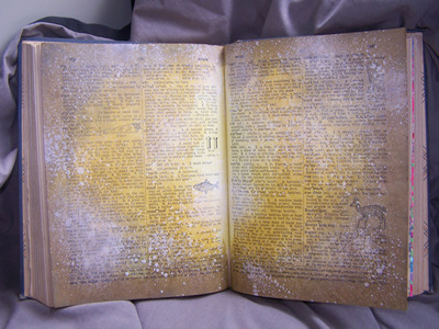 Altered Book Spread. I glued some pages together to the left and to the right just to have something more substantial to work on. I used gesso spritz and then sponged on #205 lemon yello, #227 yellow ochre, and #416 Sepia. |