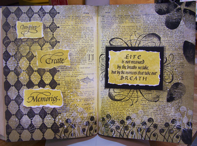Altered book spread. All black is stamped with VersaMagic midnight black and the white is VersaMagic cloud white. Along the left I used the harlequin background image... I inked it with black and then pressed an uninked flourish onto the stamp to remove some the black ink, quickly cleaned the flourish and stamped it again on the inked stamp, then stamped the background onto the page. I repeated this to finish stamping along the left edge. Next I stamped fiddleheads along the bottom with black ink and then also stamped some with white ink. The flower in the top right corner and falling petals were made by pressing the stamp pad directly onto to the page. "Life is not measured.." was stamped onto the second paper in the top row of pic #1, edges torn and layered onto black cardstock. I layed this piece on the book page and went around it with a pencil to mark it's location and then removed it. Next I stamped the flourishes as shown... I somehow smudged one of the flourishes in one spot so took my ink pad and purposely added more smudges to all of the flourishes. Attached the "Life is.." piece to the page and added shading around it with a pencil. Inspire, Create, and Memories were stamped and torn out, added to the page, and more shading done with pencil. |