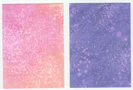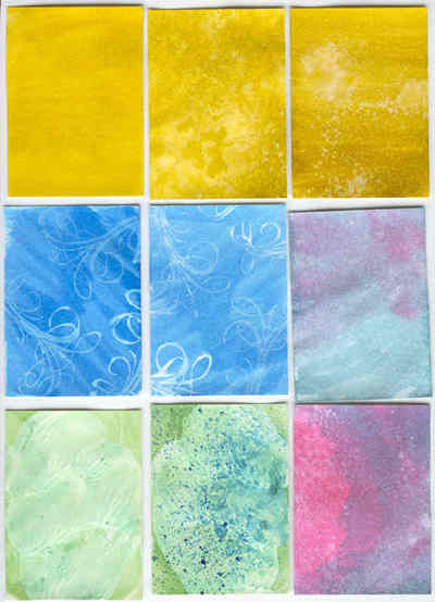 Both of these started with glossy white cardstock sized 2 1/2" x 3 1/2". Gesso spritzed both of them. Colors on the left are #337 magenta (over the whole piece first) and then #205 lemon yellow just in places. On the right is the color #548 blue violet. |