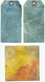 These all use gesso spritz. The top 2 are on manilla tags and the bottom one regular cardstock 4" x 4". Color used on the tags is #654 fir green. The tag on the left the color is brushed on and for the right it's sponged on. Colors used on the 4x4 are #227 yellow ochre, #411 burnt sienna, and #416 Sepia. |