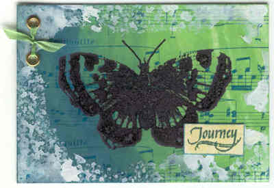 Here is another way to use your gesso/water in a spray bottle.I started with white glossy cardstock and colored it with Ecoline #600 green and #578 sky blue. Stamped the music image and then the butterfly with permanent ink. Next I sealed the piece with Microglaze. Then comes the fun :-)) Use petroleum jelly over the part of the piece that you don't want gesso on.. here I covered the center area with the butterfly. Shake up your gesso/water mix and spray over the whole piece. Now you can either let the gesso air dry or you can use a heat tool but be careful because the petroleum jelly will start running if it gets too hot. After the gesso dries you wipe off the petroleum jelly revealing the image you covered. I finished this atc up by stamping "Journey" on a piece of cardstock with Distress Ink pine needles, cutting it out, sponging on a little Distress Ink shabby shutters, and edging it with Distress Ink broken china. Two gold eyelets were added to the top left corner. I took a piece of white silk ribbon and colored it with #600 green, dried it with a heat tool and tied it through the eyelets. |
