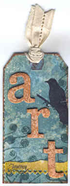 This uses the "sponged" tag from pic #2. I also did the gesso spritz technique on the white chipboard letters and then sponged on #411 burnt sienna. Burnt sienna was also sponged around the edges of the tag. Fiddleheads were stamped onto the tag with Distress Ink pine needles. Taking a scrap piece of gesso spritz/yellow ochre colored paper, I punched a border image along one side, tore the other side, and layered it across the tag. Bird and "Journey" were stamped with black ink. Attached the letters to the tag. Decided I wanted some "stitching" down the left edge and did it first with the Inkssential pen and then with a black fine point pen. Added the vintage trim to the top. |
