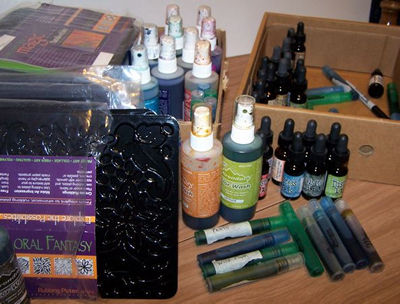 When they first came out with the Mini Mister bottles I resisted getting them. I thought they were too much money when you could go to a discount store and get spray bottles for less than a buck. But after hearing again and again how much nicer they were I finally decided I needed to give them a try and I've come to the conclusion that they are worth the extra money. And as you can see from the picture, I've invested in quite a number of them and I'm sure I'm not done yet :) They spray much nicer than the cheaper bottles and I like the size and how nice they fit in your hand. For this article I've used them to mix up distress ink sprays by putting one dropperful of Distress Ink reinker in the bottle and then adding water. Don't fill the bottle all the way up or when you put the sprayer back in and screw on the top it will overflow. I've also made lighter versions of the Adirondack Color Wash sprays by mixing them with water in the spray bottles. I prefer to use distilled water when mixing sprays to be sure that over time it doesn't go bad. If you like shimmery sprays you can also add a little bit of Perfect Pearls to the bottle and shake well before using. You could also make your own colors by mixing reinkers together. |