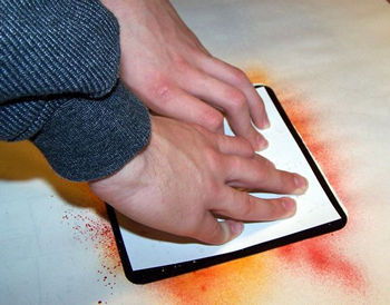 Lay a piece of paper over the plate and being sure to hold the paper steady, press and rub over the paper. Don't be too quick to remove the paper, allow time for it to absorb the liquid. | ||