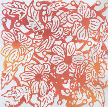 Background #1 The rubbing plate is from the Garden Flowers pack. Sprays are Distress Ink fired brick and Distress Ink spiced marmalade. |
