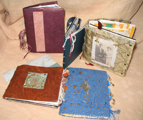 creating, the only hard part's to begin" In this workshop we will explore a variety of methods for getting words on your altered page, adding text and texture as a feature element, or to compliment other artwork on the page. We will play with some letter styles as well as vary size and letter proportions to see how this affects visual impact on the altered page. We will incorporate envelopes, fibres, tags, folded pages, beads and niches to our books and explore a variety of other altering techniques. Using friends and family as a theme for your book provides an excellent place to begin, although you may choose any theme that strikes your fancy - or none at all! You will need at least one book to alter. I suggest a modern hardcover novel of approximately 200-300 pages, in which the pages are sewn in (not glued) and are not glossy. It does not have to be a very old book or even have a title that "speaks" to you, but that can be a bonus! You will receive a recommended supply list upon registration, but think about bringing colour copies of photos that are appropriate to your theme as well as favourite quotations. Come with your experimental spirit! If you've never altered before, this is a great place to start! You may wish to bring your own stash of brads, eyelets and embellishments although almost everything you need of that type will be available in class. Class supply fee: $20. Student supply list · Ruler with metal edge - at least 12" *I usually have these for sale at classes |