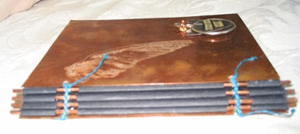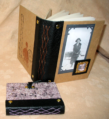 Harlequin Stitched Spine Journal This delightful book incorporates an exposed harlequin stitching pattern through a leather spine and incorporates rivets into the structure. You may decorate your book with a copy of an old photo and add other embellishments if you wish. The cover of the book we will be making is class is approximately 8 1/2" tall by 5 1/2" wide. Extra Tools: Hammer and punch If you can't get to the class, check out the kit on my site here! |