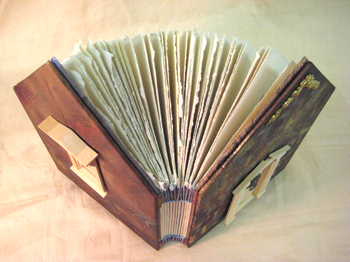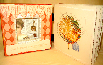 What is an Altered Book? Consider it a recyling project for saving books from the landfill! In this class we will take a book and begin the altering process, breathing new and personal life into the pages. We will focus on many methods of altering, including incorporating envelopes, fibres, folded pages, niches and more. Fast-drying acrylic paints will be utilized throughout the class. Our theme will be friends and family. Some supplies will be provided, but please bring a pencil for marking and note-taking, your favourite quotations, rubber stamps and pads, copies of old family photos, any eyelets, brads and embellishments you may have and your experimental spirit! You will also need a book to alter. To start, I suggest a modern hardcover novel of approximately 200-300 pages, in which the pages are sewn in (not glued) and are not glossy. |