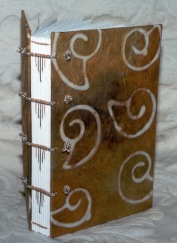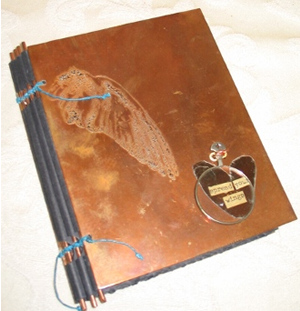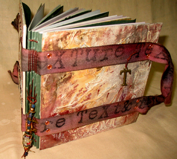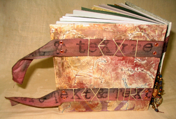 The Text and Texture Journal In this workshop we will use a rich and varied selection of papers to assemble a journal that will fascinate the owner before it is even filled! The cover will be decorated using techniques that will give wonderful texture embedded with intriguing inclusions. The pages will be bound by stitching over hand dyed and stamped straps which are eyeleted through the cover. As well as the usual bookbinding supplies, students should bring (specifically for this class)